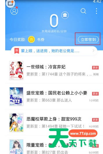 QQ阅读非常受大家欢迎的,但一些伙伴还不会在QQ阅读里签到,所以今天天天下载带来的这篇文章就详细讲解了在QQ阅读里签到的简单操作。在QQ阅读里签到的简单操作 打开QQ阅读,在主界面的上方有一个“立即签到”按钮,点击它,即可进行签到。 各位小伙伴们,看完上面的精彩内容,都清楚在QQ阅读里签到的简单操作了吧!@天天下载 除特别注明外,本站所有文章均为 天天下载 原创,转载请注明出处来自 https://www.ttzip.com/61518.html