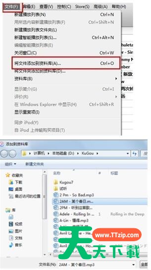 2、打开iTunes,点击“文件”——“将文件添加到资料库”,选择要添加的歌曲,点击“打开”。