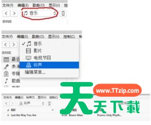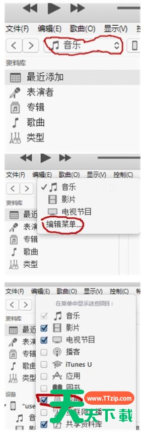 6、点击“音乐”——点击“编辑菜单”——勾选“铃声”选项——确定(此步骤很重要,是为了让“铃声”选项在列表中直接显示出来。)