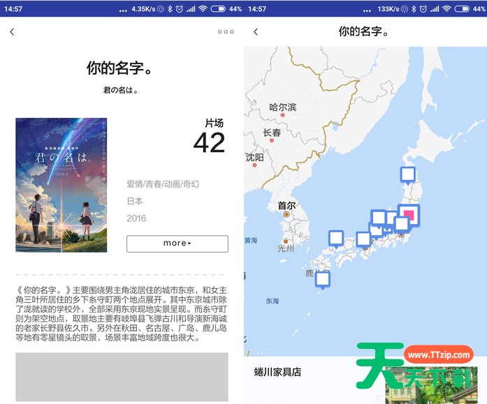 那么要怎样在片场APP中寻找电影的圣地巡礼地点?以《你的名字》,进入到影片主页后,就可以看到影片的简要信息以及地图了,在地图当中可以看到片子的“圣地”都分布在哪里,点击地点可以了解详情,能够看到地点对应的是影片的那一幕,巡礼起来可谓是非常方便了。