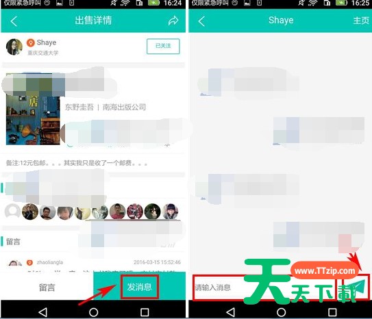 很多人都喜欢用旧书街APP,但是不少伙伴还不知道旧书街APP私信好友的简单操作,所以今天天天下载就分享了旧书街APP私信好友的操作方法,一起来学习学习吧。旧书街APP私信好友的简单操作 1)点击打开【旧书街】,然后点击要私信好友的头像;(如下图) 2)点击右下方的【发消息】,然后点击下方的编辑框输入私信内容,最后点击旁边的【按钮】即可。(如下图) 以上就讲解了旧书街APP私信好友的简单操作,希望有需要的小伙伴都来学习哦。@天天下载 除特别注明外,本站所有文章均为 天天下载 原创,转载请注明出处来自 https://www.ttzip.com/61872.html
