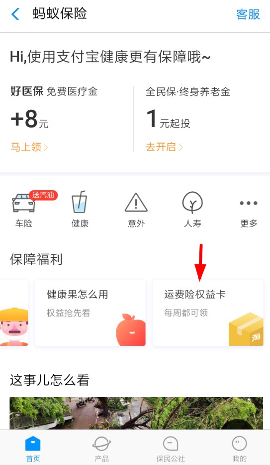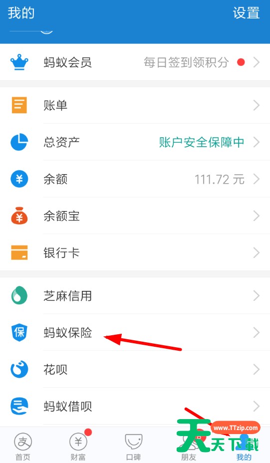 1、目前来说,大家要想领取支付宝里的运费险权益卡,那就应该先从右下角点击进入个人中心,并且打开“蚂蚁保险”功能。