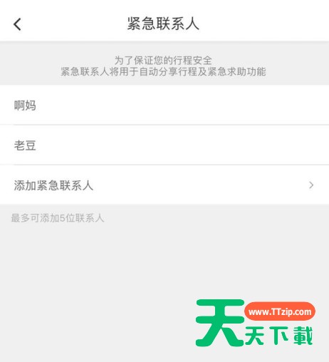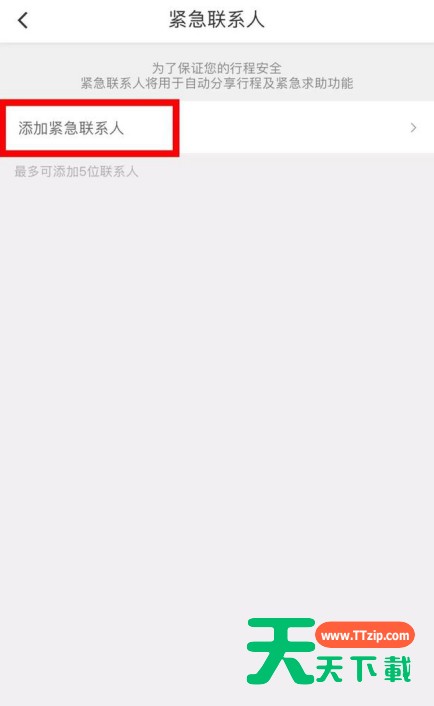 有些小伙伴还不了解滴滴出行添加紧急联系人的具体操作,所以下面天天下载就讲解了滴滴出行添加紧急联系人的操作过程。 滴滴出行添加紧急联系人的具体操作 打开滴滴出行APP,点击“设置”进入设置界面, 点击“紧急联系人”, 选择“添加紧急联系人”,选择自己信任务的亲朋好友, 设置好之后,你的行程可以选择自动分享给他们,以及进行紧急求助功能,这一点至关重要, 返回设置页面,点击“行程安全”, 点击开启“自动分享行程”,这个开启之后,你设置的紧急联系人就能知道你的行程位置,确保你设置的家人小伙伴清楚你所在的位置, 最后就是“设置时间段”,例如下班回家时间等,设置好之后,在时间段内坐车,紧急联系人都能第一时间收到, 以上安全功能都设置好了之后,你就可以在行程当中随时使用紧急求助, 一旦行车过程当中发现有什么不对劲的情况,请立马点击紧急求助,以便第一时间通知家人, 确保自身安全之后,再点击取消求助就好了。 上面就是天天下载带来的滴滴出行添加紧急联系人的具体操作教程,有需要的小伙伴一起来学习吧。@天天下载 除特别注明外,本站所有文章均为 天天下载 原创,转载请注明出处来自 https://www.ttzip.com/65048.html