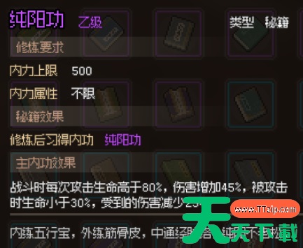 大侠立志传纯阳功怎么获得呢?很多玩家还不太清楚,下面给大家带来的是大侠立志传纯阳功获取教程,一起来看一看吧。 大侠立志传纯阳功获取教程 非常优秀的不需要属性的内功,特效非常不错 获取方式: 神捕门掌门好感60 邀请入队获取 @天天下载 除特别注明外,本站所有文章均为 天天下载 原创,转载请注明出处来自 https://www.ttzip.com/8537.html