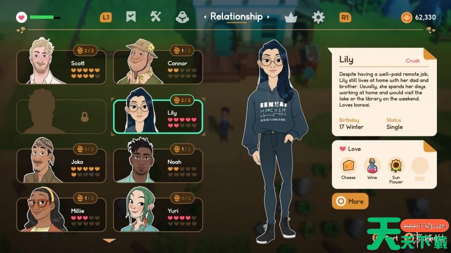 游戏中有16个单身人士供玩家交流,玩家可以了解他们的性格、与他们约会并共坠爱河,甚至结婚生子。