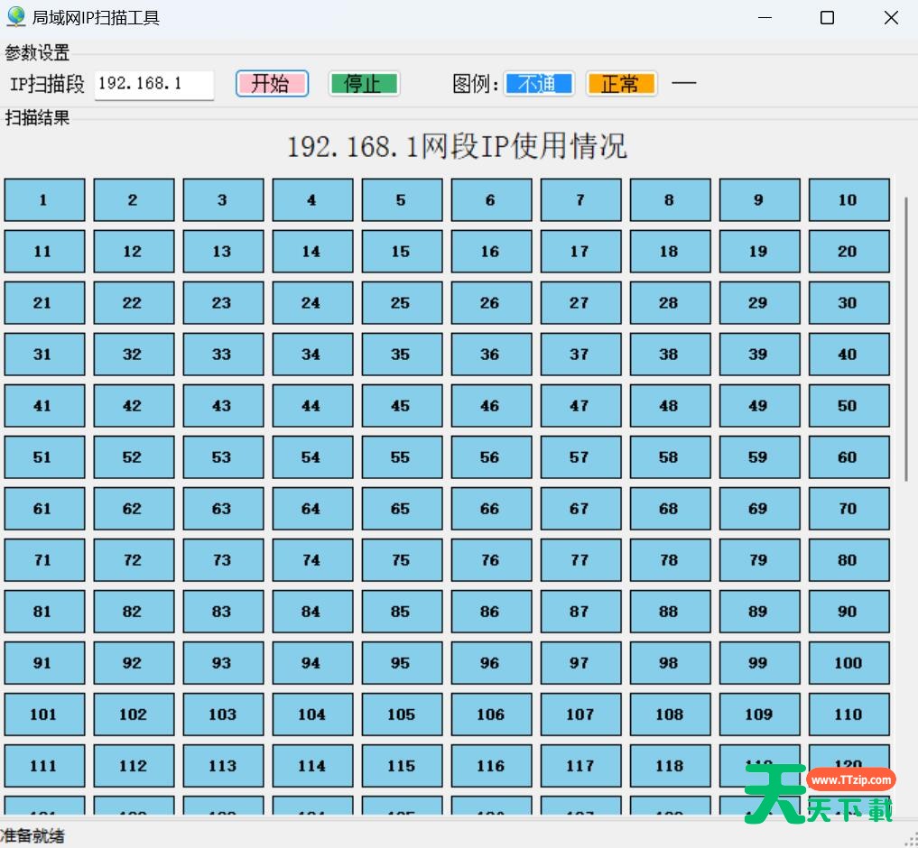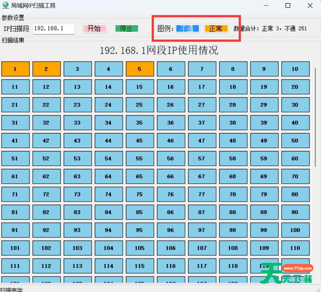扫描结束后,工具会将网络通讯正常的IP地址高亮显示,并显示网络通讯正常的数量和网络通讯异常的数量。