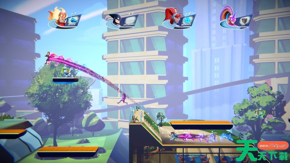 充满活力的角色阵容由离经叛道的超级英雄组成,其中既有旧人回归,也有新人加入;从中挑选一个你喜欢的角色,在疯狂的竞速比赛中直面你的对手。每个游戏大厅可容纳多达8位玩家,本地或线上均可。