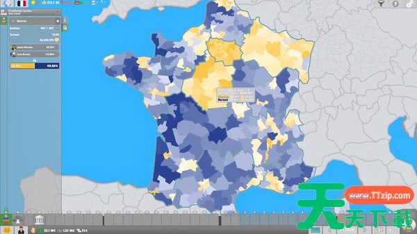 游戏包含一张精心制作的世界地图,涵盖国家、地区/州的划分和城市。玩家可以通过过滤器查看人口密度、外交关系、GDP增长等信息。