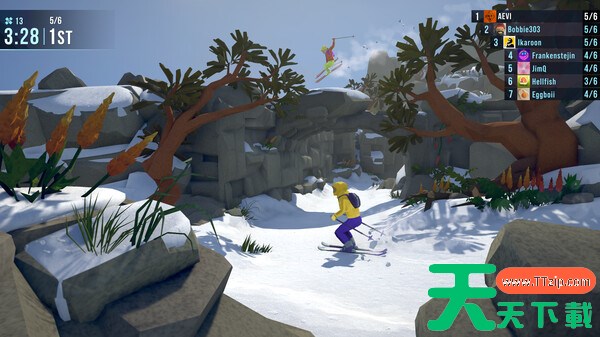 合作模式: 玩家可以与2-8人组队同行,共同面对挑战。队伍需要共享有限的检查点,合作规划最佳的滑雪路线。