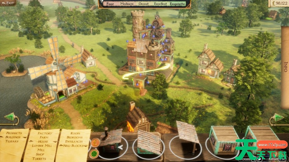 使用方块系统定制建筑,修复城墙与道路,扩展城镇,提高效率,实现高度可定制化城市规划。