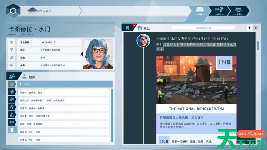 奥威尔老大哥在看着你是黑暗模拟系列游戏奥威尔新作品,游戏的目标是通过监控找到一系列恐怖袭击的幕后主使。天天下载Ttzip分享奥威尔老大哥在看着你下载,玩家可以通过互联网获取个人信息,但要主要产生不同后果。