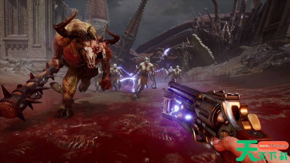 游戏采用暗黑哥特式场景设计,破碎教堂与血月天空构成炼狱舞台,搭配粒子特效渲染的爆炸断肢效果,强化视觉冲击力。