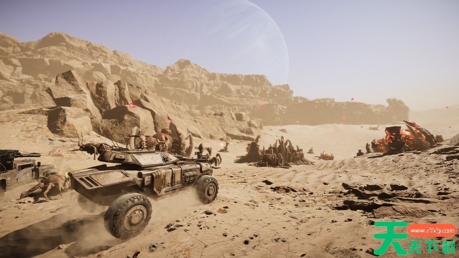 操作巨型采矿机甲进行资源掠夺,驾驶悬浮坦克利用沙丘地形实施伏击,外星生物载具可分泌腐蚀黏液改变地表属性