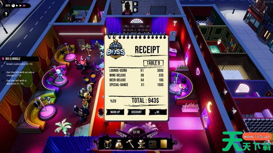 精心接待 VIP 客人,及时补充酒吧库存,招募特色舞者,举办疯狂主题派对,打造顶级娱乐帝国。
