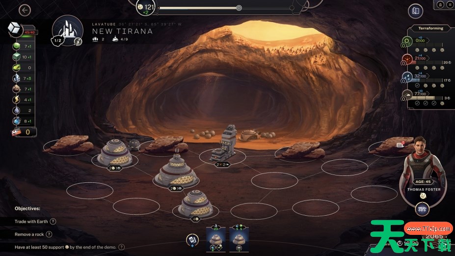 设计从嗜极细菌到哺乳动物的完整生物圈,每种植被需匹配土壤酸碱度与气压条件,熊类栖息地可提升区域稳定性但消耗大量氧气资源,构建脆弱而精密的生命网络