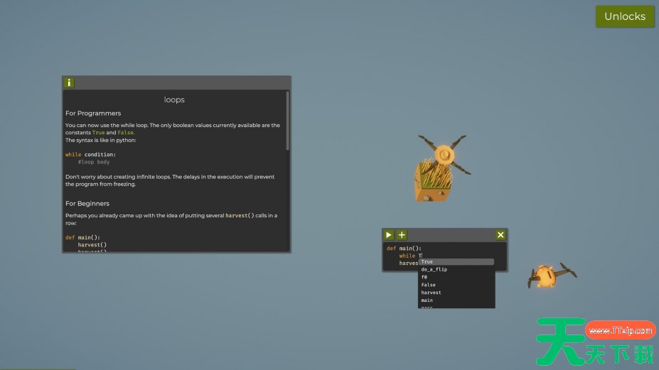 农民被替代了(The Farmer Was Replaced)是一款加入了自动化编程玩法的农场模拟经营游戏,通过对无人机进行易于理解的编程,使其完成逐级复杂的农场作业。天天下载分享农民被替代了下载,以初学者易于理解的编程概念帮助玩家入门,并通过图形动画让程序步骤变得生动。