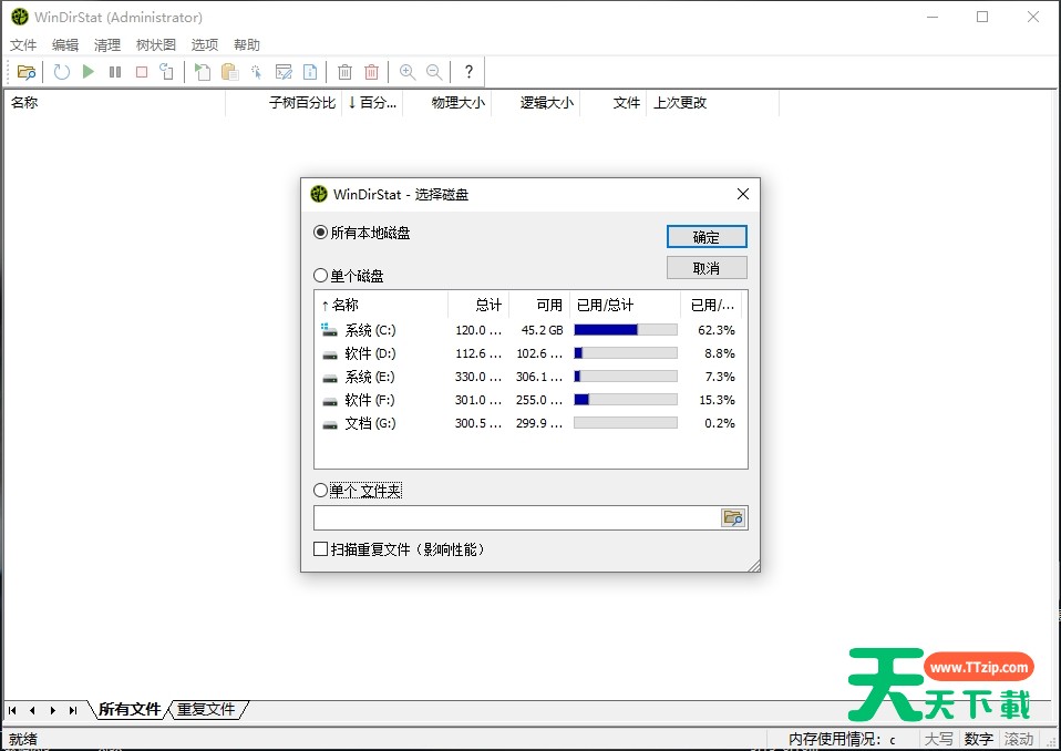 3、目录树模式中也带有多种统计方式,分析过后,你可以看到每个文件夹的体积、文件夹下带有多少文件、以及每个文件夹占用空间的百分比。