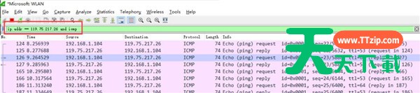 4、操作完成后相关数据包就抓取到了。为避免其他无用的数据包影响分析,可以通过在过滤栏设置过滤条件进行数据包列表过滤,获取结果如下。说明:ip.addr == 119.75.217.26 and icmp 表示只显示ICPM协议且源主机IP或者目的主机IP为119.75.217.26的数据包。