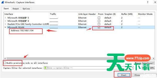 1、打开软件之后,选择菜单栏上Capture -> Option,勾选WLAN网卡(这里需要根据各自电脑网卡使用情况选择,简单的办法可以看使用的IP对应的网卡)。点击Start。启动抓包