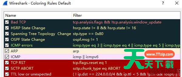 6、数据包列表区中不同的协议使用了不同的颜色区分。协议颜色标识定位在菜单栏视图 --> 着色规则,如下所示。
