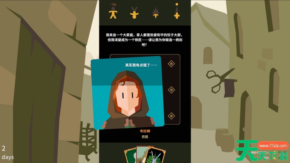游戏采用独特的卡牌决策机制,玩家通过左右滑动卡牌做出选择,这些选择直接影响杰洛特的声望、财富和生命值。