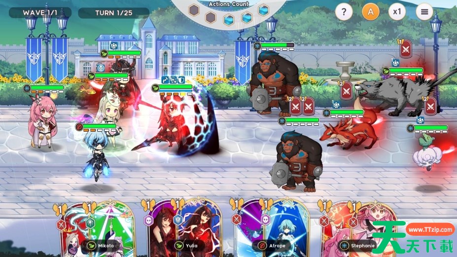 玩家可组建最多5名美少女的队伍,每角色拥有3种技能。